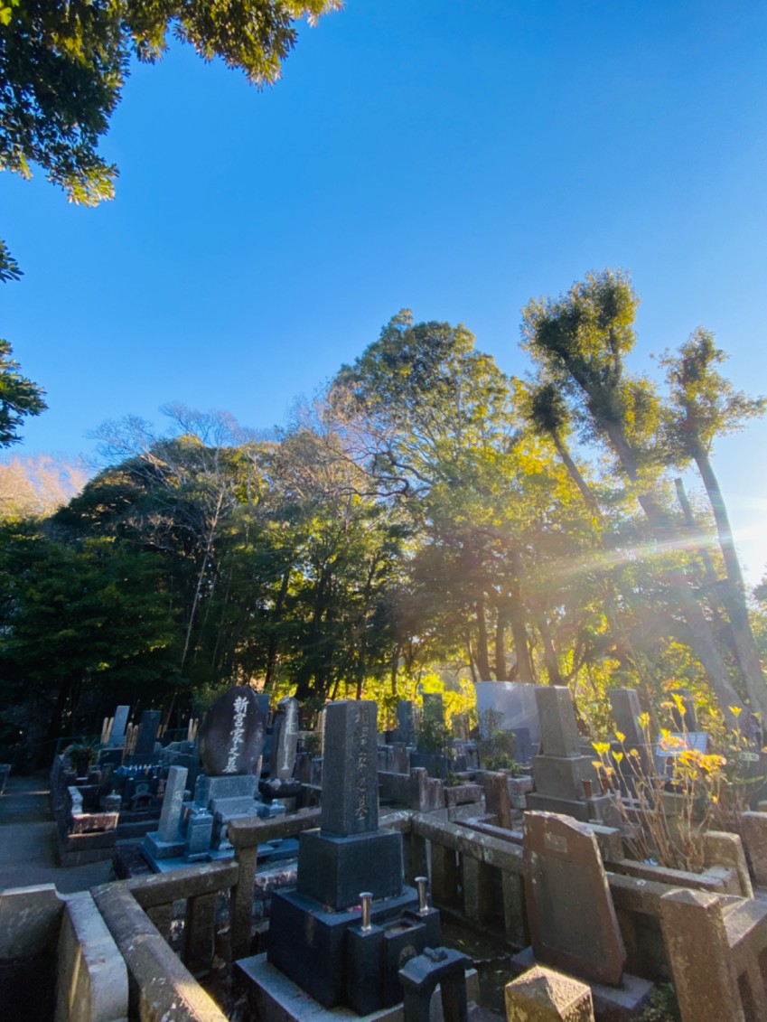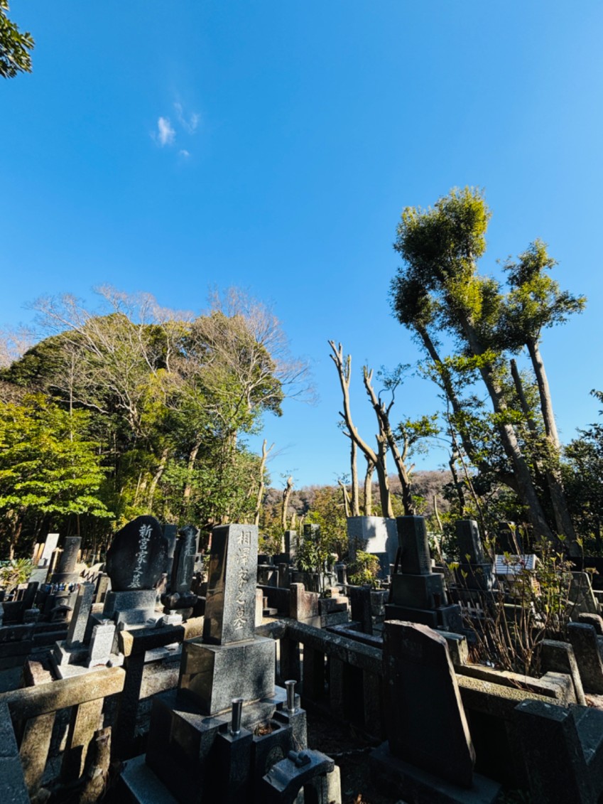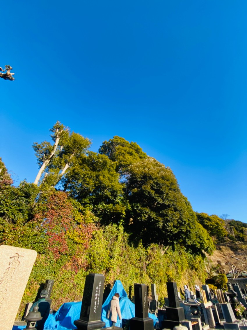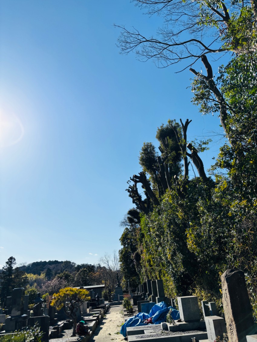 お墓の近くに立つ樹木の枝が張り出しており、